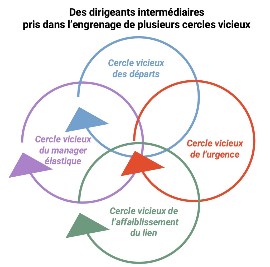 • Avec au final un cercle vicieux du manager intermédiaire engagé : plus il court partout pour écoper sans se plaindre, plus sa hiérarchie pense qu’elle peut s’appuyer sur lui, et plus le poids qui pèse sur lui devient intolérable. Lui-même finit par trouver normal de vivre dans un stress maximum, de courir partout, et avance vaille que vaille. Les managers qui craquent sont ainsi les plus engagés, ceux qui ont voulu faire face à la pression, qui ont à cœur de bien faire et qu’on croit inaltérables… jusqu’à la rupture.